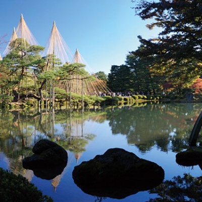 日本三名園のひとつに数えられている兼六園。敷地は約11.4万平方メートルと広大で、園内を廻遊して鑑賞する廻遊式庭園となっています。加賀藩の歴代藩主が代々作庭してきたと言われているこの庭園は、春は桜、夏はかきつばた、秋は紅葉、冬は雪吊りなど、四季を通じて美しい自然を楽しむことができます。雪吊りは雪の重みから枝を守るために、木の枝に「りんご吊り」などの方法で縛り上げるというもの。秋・冬の夜間には無料で園内が開放され、期間限定でライトアップした姿を見ることができます。冬の風物詩として、毎年人気を博しています。